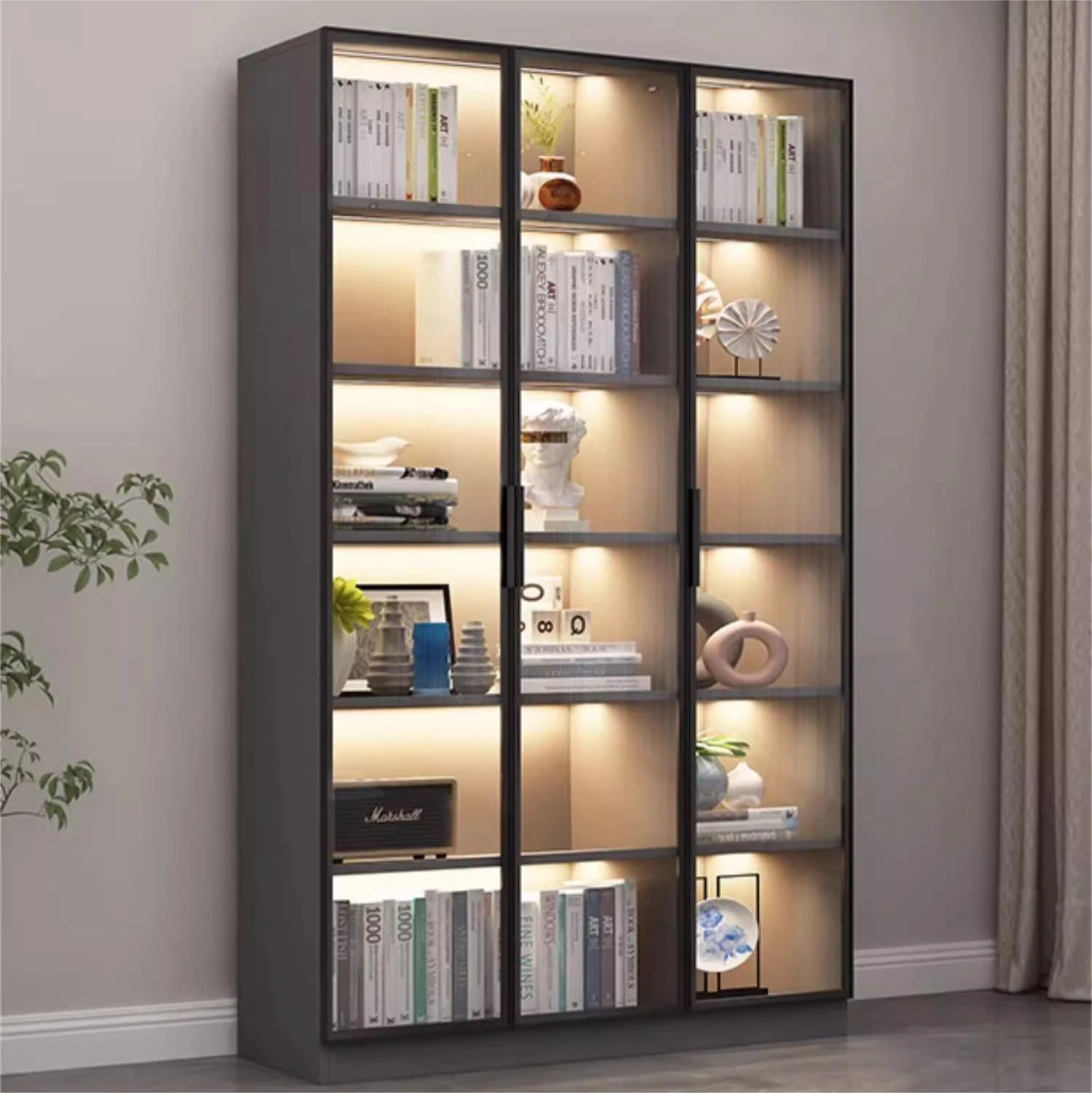 モダンで軽やかな高級感漂うガラス扉付き書棚 - 壁掛け一体型のシンプルな全高デザインで、リビングに最適な本を美しく展示!