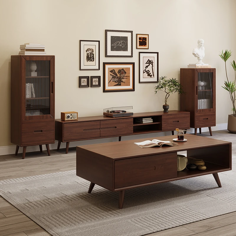 エビソン全実木リビング用新中式コーヒーテーブルセット、コンパクトな胡桃色テレビキャビネット付き!スタイリッシュで機能的、小さなお部屋でも魅力を引き立てます。