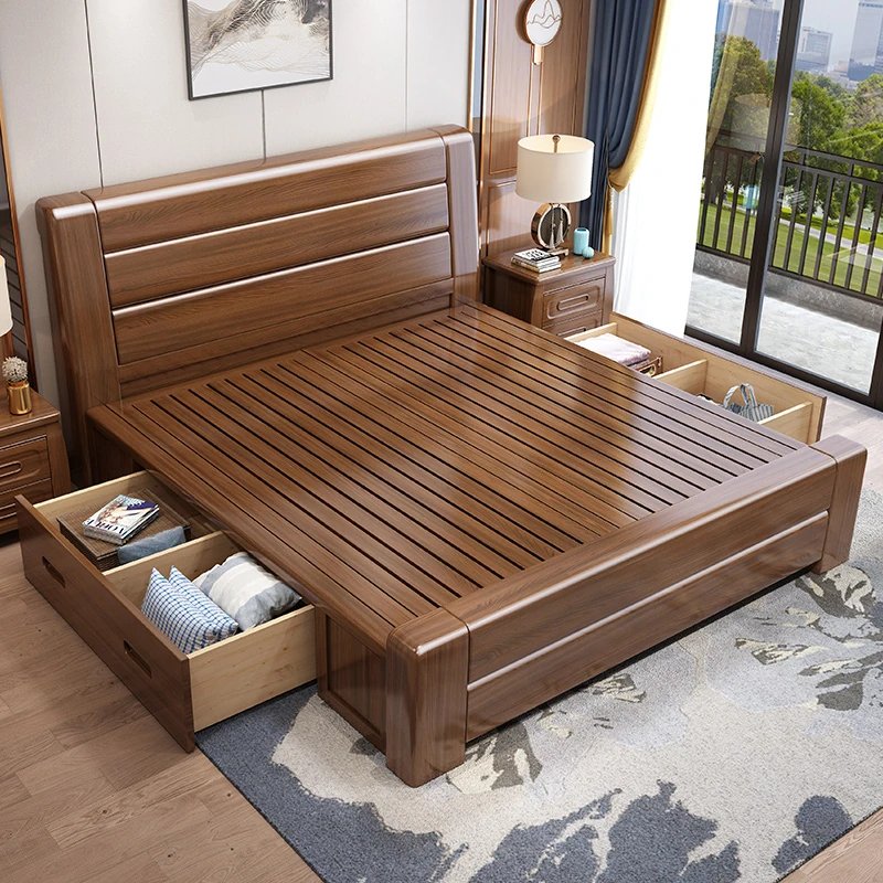 Yamaiya Walnut Wood New Chinese Style Solid Wood Bed - 1.8m Master Bedroom Double Bed & 1.5m Storage Wedding Bed - Direct Factory Sale for Modern Elegance and Durability.