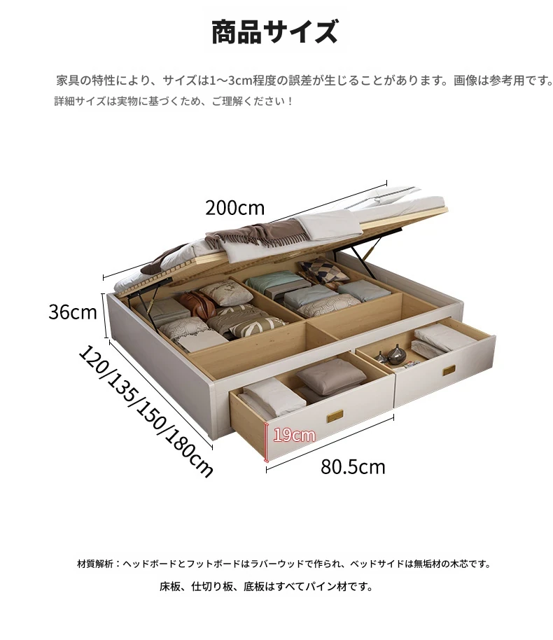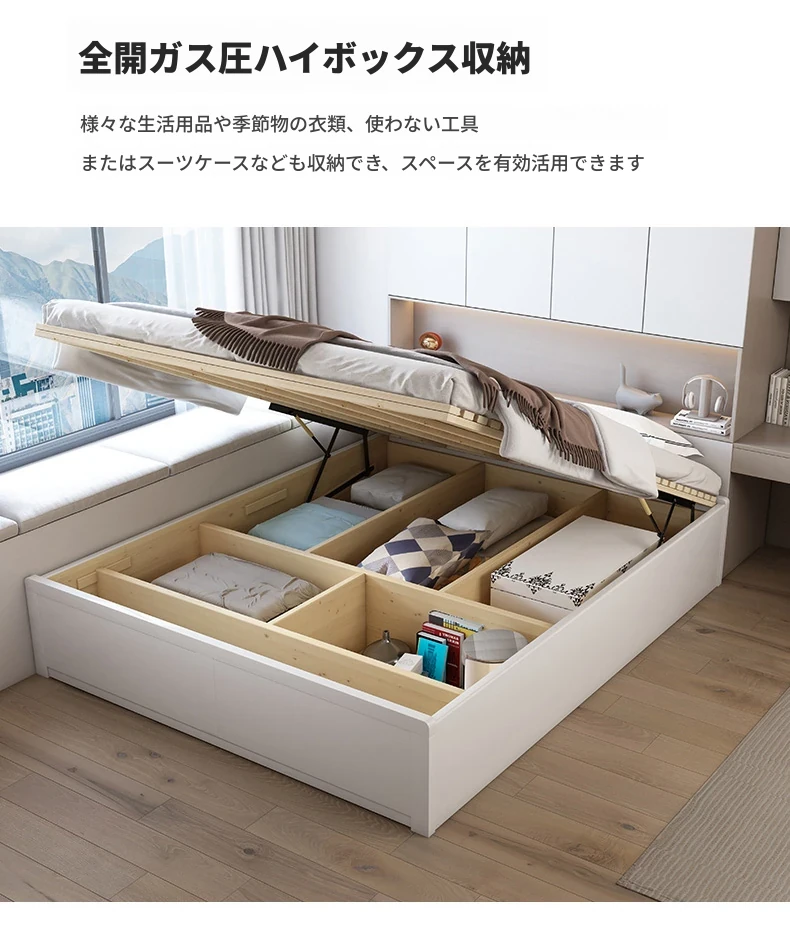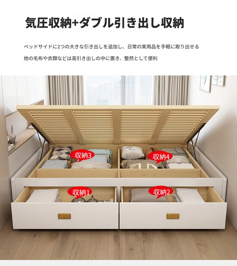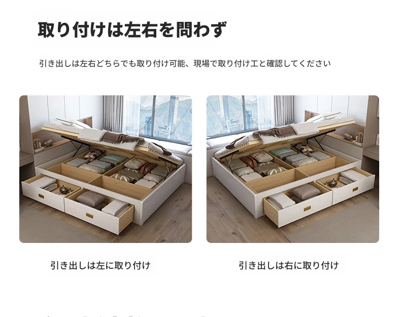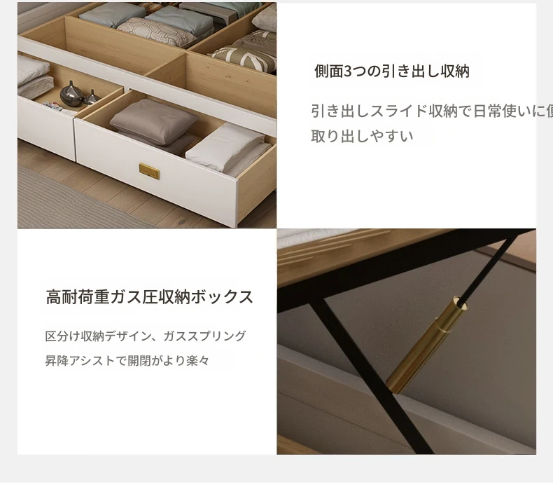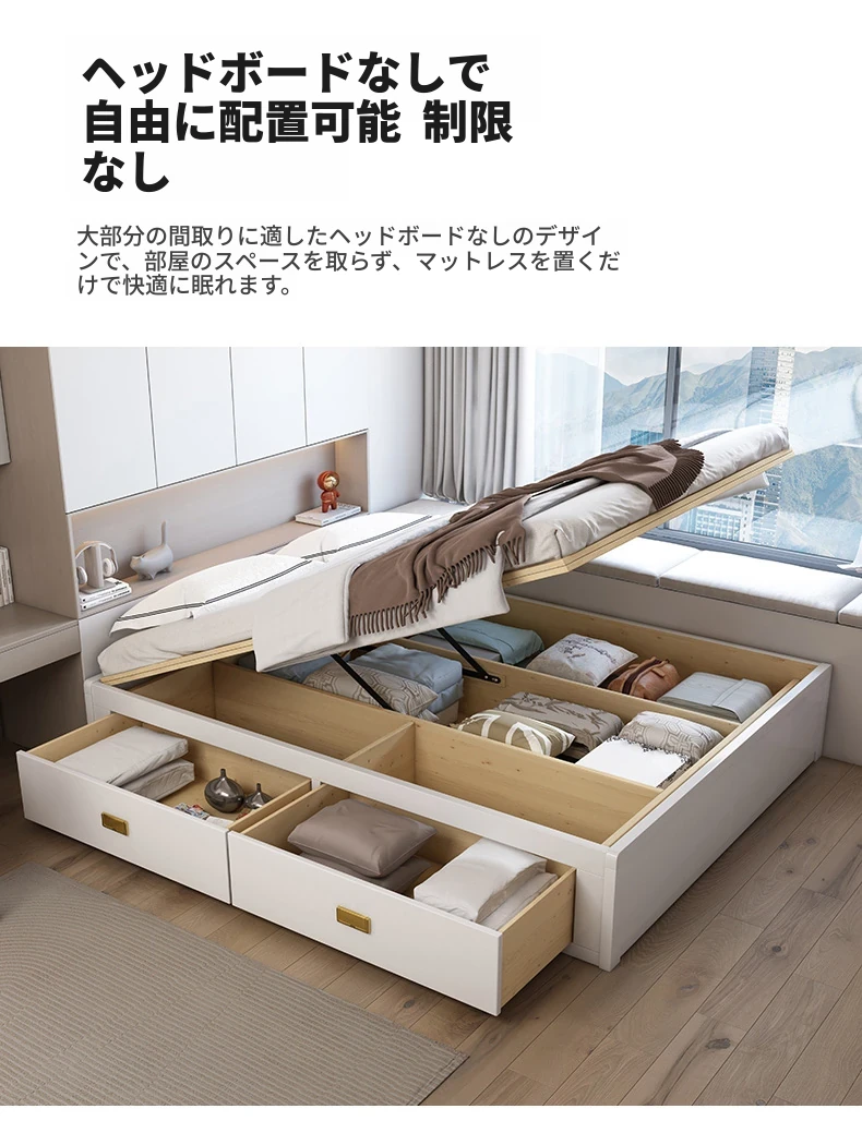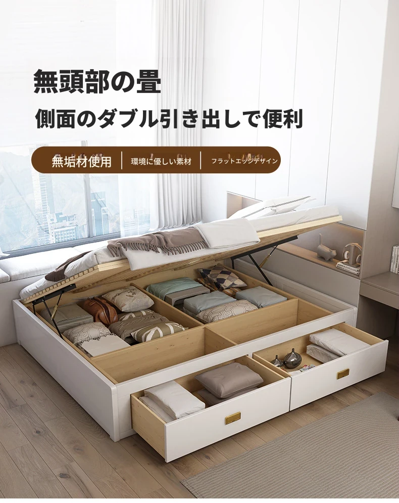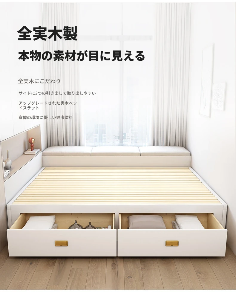 ユニークなデザイン!全実木製のヘッドボードなしのフラット畳ベッド。収納付きで、コンパクトな小型住宅にも最適。サイドオープンの引き出し付きハイボックスで、便利さを追求した次の寝室にぴったり!